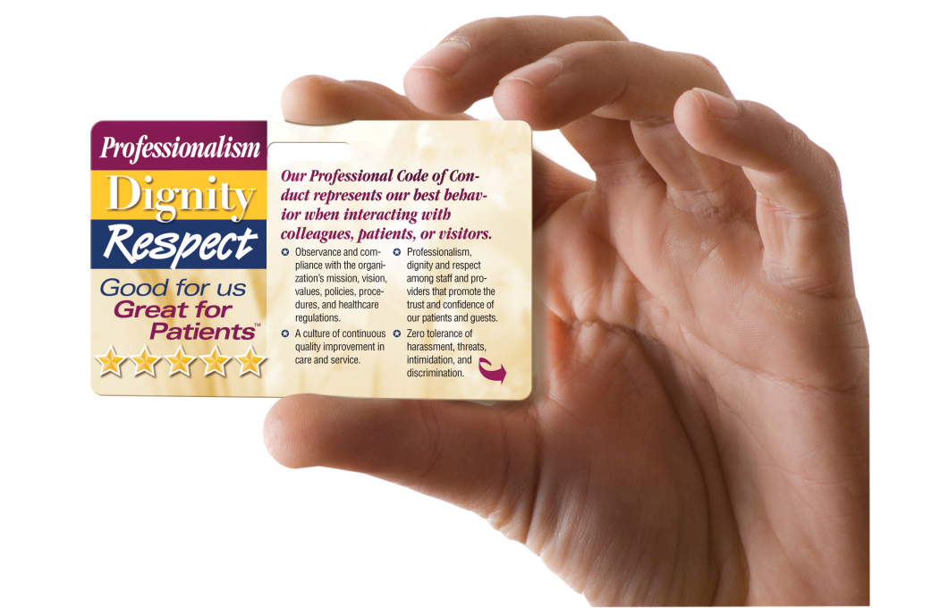 Badgie™ Cards showcase our “Professionalism, Dignity, and Respect” theme along with a list of professional behaviors. Badgie™ Cards attach directly to staff ID badges and lanyards, serving as a constant reference and learning tool.